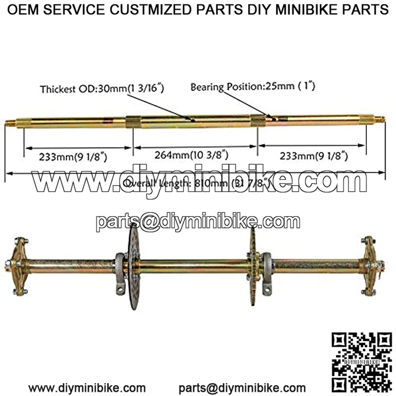 Overall length 32 inch (810mm), 1″ in diameter and the thickest part of the axle is 1 3/16″ (30mm)
