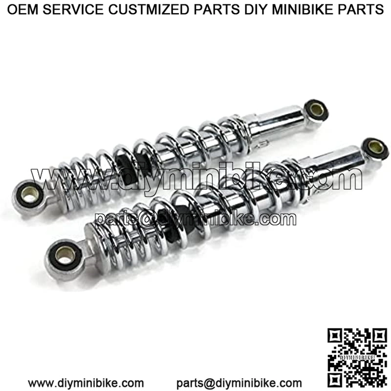 The go-kart shocks features 12″ eye-to-eye length and 0.47″ (12 mm) hole ID.The go-kart shock absorbers are made up of chrome-plated springs resistant to the elements and the heat of the vehicle.The buggy shocks can bear 450 lb (204.12 kg) compression loading capacity, absorbing shock efficiently, and offering a comfortable drive.The mini bike seat shocks fit go-karts and mini bikes of Yerf-Dog and other makes.