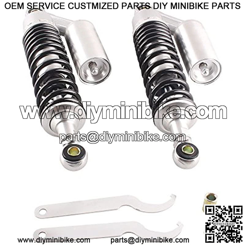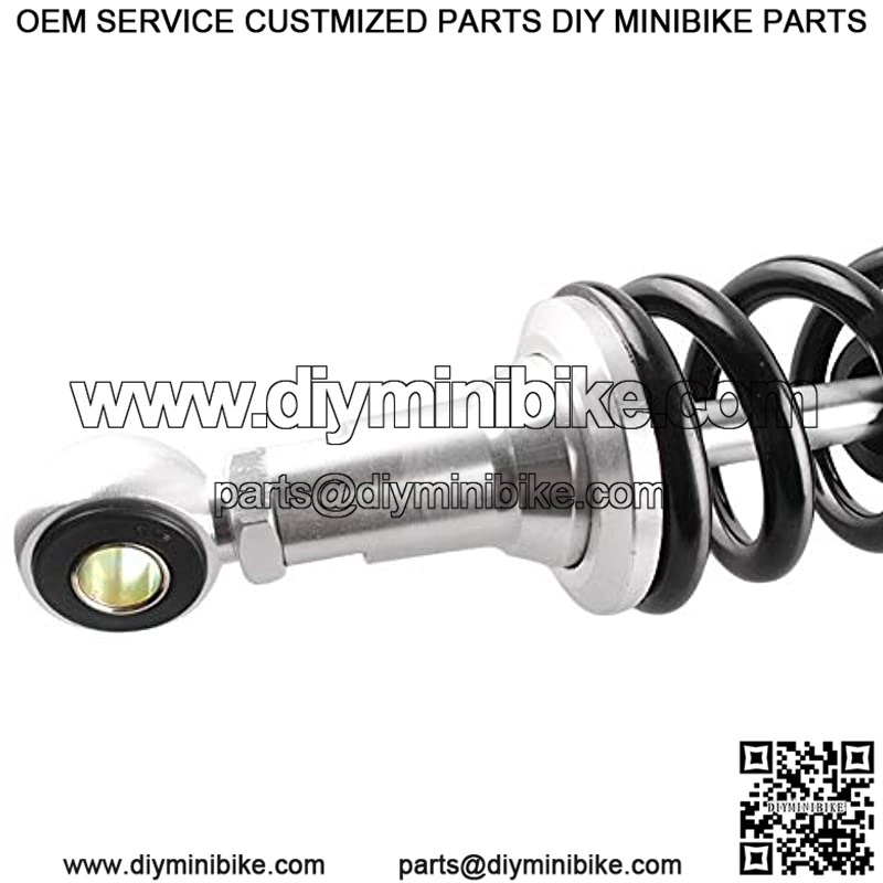 A Pair of Round Hole 400mm Aluminum and Solid Steel Shock AbsorberPressure can be adjusted by springs or air (gen); Operation of the coil-over springs and air cylinder is helpful to reduce the shock.Shock Absorber bottom/ends type: Round EndNo instruction included, professional installation recommended.Universal fit for most 400mm Motorcycle Shock Absorber For Honda/Yamaha/Suzuki/Kawasaki;Dirt bikes, Gokart, ATV, Motorcycles and Quad.Color:Silver and Black | Size:400MMDescription: Dimension: Total Length: 430mm (17″) Length of Eye to Eye Core: 400mm (15 3/4″) Eye Diameter(with bushing): 12mm Eye Diameter(with bushing removed): 16mm Eye Thickness: 21mm Eye Maximum Tensile Strength: 2,000 Kgf Spring Thickness: 7mm Spring Width: 60mm Working Stroke: 68mm Spring Stiffness: 110 kg Maximum load: 300 kg (660 lbs) Air Reservoir: Adjustable Factory Air Pressure: 0.4 Mpa Maximum Air Pressure: 0.5 Mpa A complete pair RFY air gas shocks absorbers Easy to install,no Installation Instructions Pres