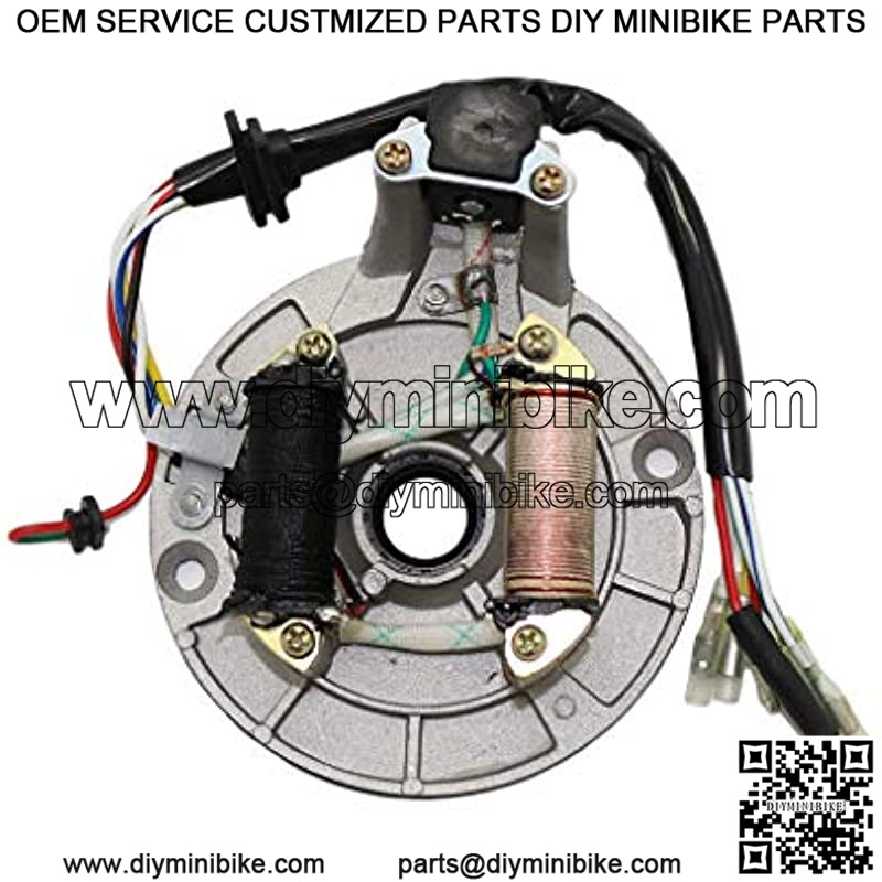 2-coil Magneto stator plate Compatible with 50cc 70cc 90cc 110cc 125cc dirt bike pit bike atv quad go kart ATVs and quads. Compatible with most of the brands from China such Comes with 2 coil and 6 wires(red,yellow,white,blue/white,red/green,white/green)(including 1 removable free wire) Full copper coil, Enameled wire full copper, Aluminum plate disc, High density material to prevent damage Pleaee note: This one not fit electric start model. Please choose the matching model to purchase when you purchase, I wish you a happy shopping.