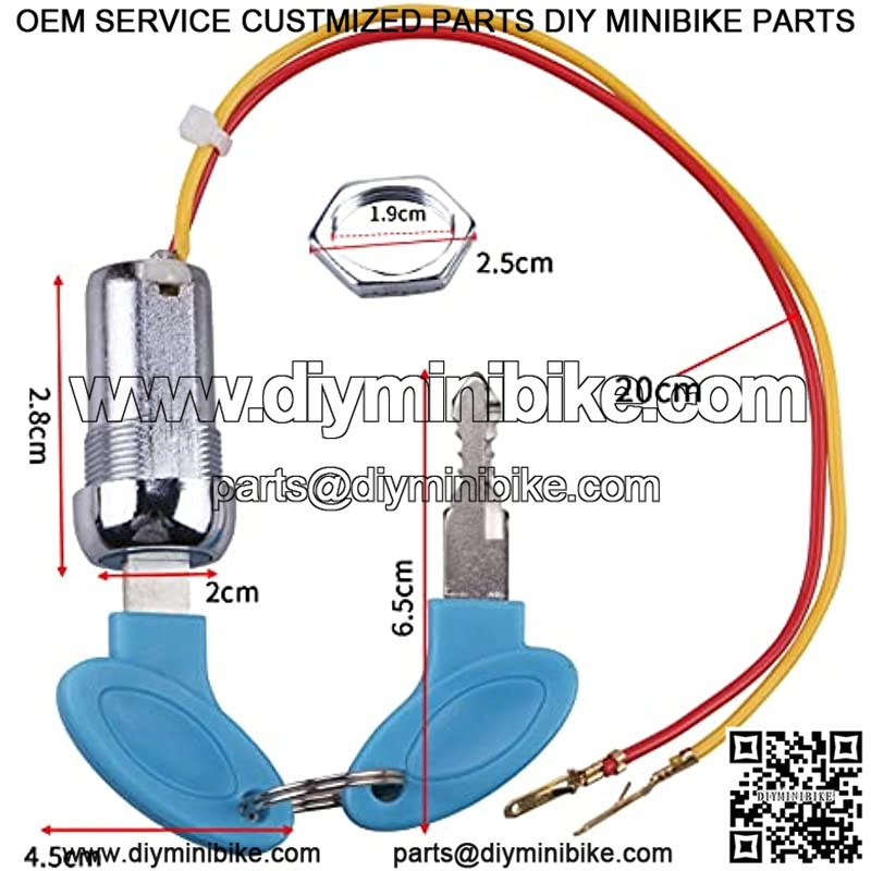 Ignition key Switch compatible with Electric Scooters, Electric bicycle, Gas lever lock, ATV, Moped, Go kartLock diameter: 20mm; Line length:200mm; Key size:65x45mmDesigned with a reliable ignition switch locking mechanismHIGH QUALITY METAL ALLOY:This Ignition Starter Switch is made of metal alloy material,solid to usepackage: 2x Ignition Switch + 4x key