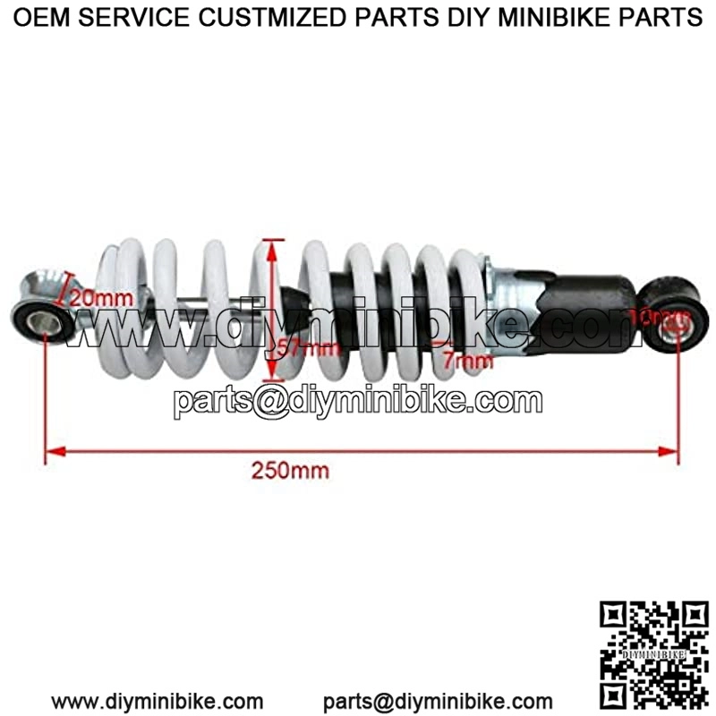 Rear suspension shock absorber, suitable for quads, some pit bikes, buggies and projects A precision made part for strength and durability This suspension provides a smoother ride and better overall damping management Fits many other bikes with similar dimensions and poundage. Measurement(approximately) : Eye center to center: 250mm (9.84″) Mounting hole diameter: 10mm