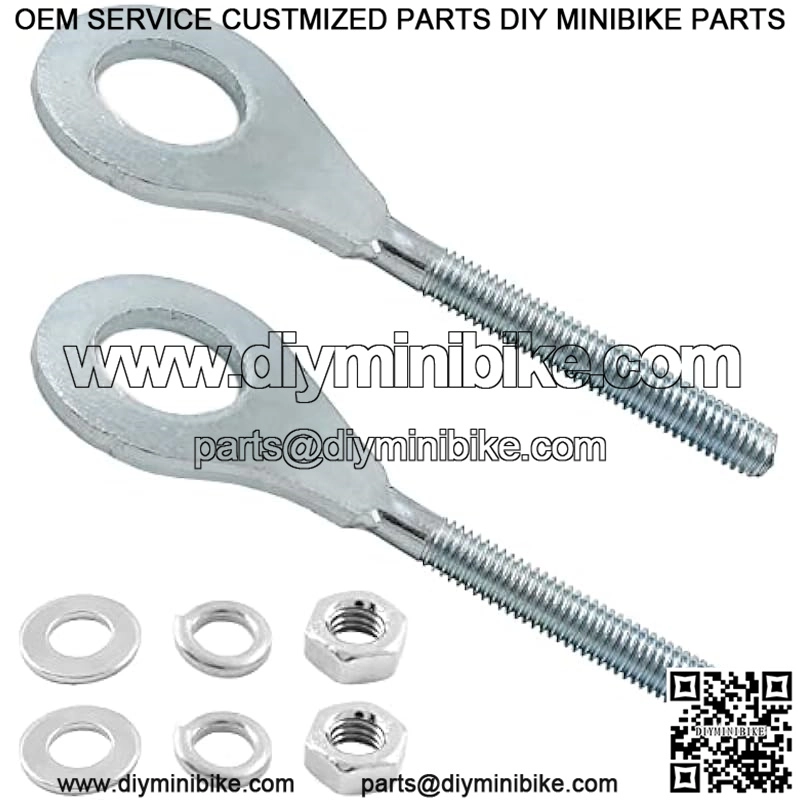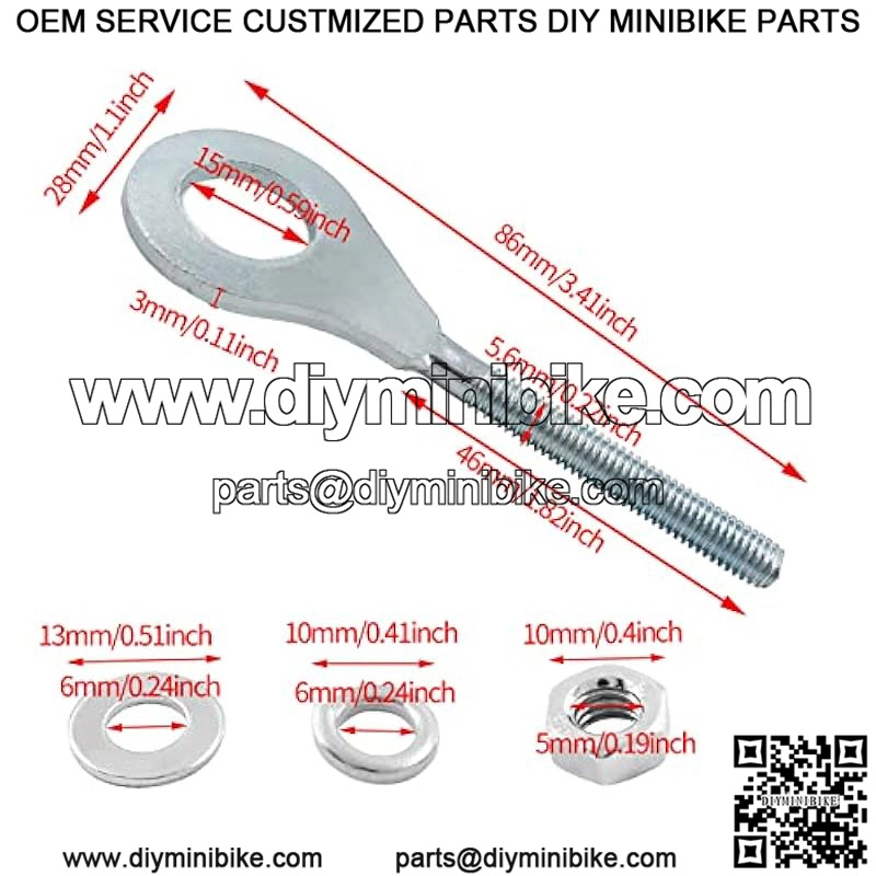 What You Get: 2Pcs chain adjusters, 2pcs nuts, 4pcs shims. Total length is 86mm/ 3.41inch, bolt diameter (axle hole) is 15mm/ 0.59inch, screw thread is 5.6mm/ 0.22inch. Enough quantity to meet your daily needs.