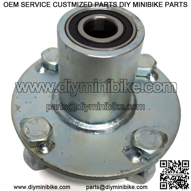 Plated steel wheel hub with 3/4″ ID bearings. Four bolts on a 4″ circle. 1/2″ – 20 x 1-1/4″ welded bolts. 2-13/16″ center to center. Use with 4.5″ long spindles. Lug nuts included. Bright zinc plated.