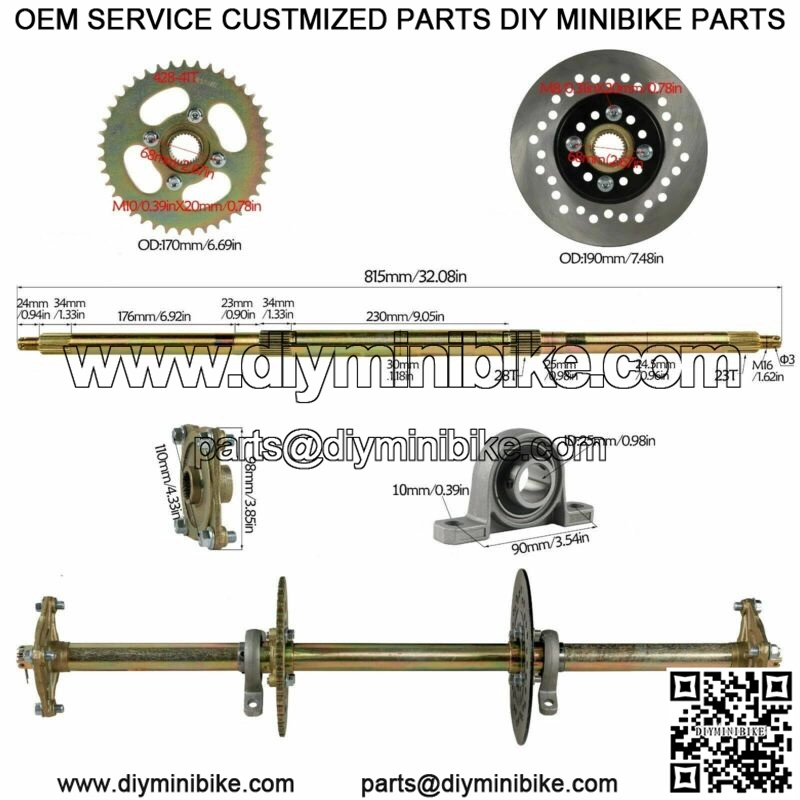 Rear Axle Kit:Axle Overall Length (from End to End): 815mm (32″)The Thickest Part of the Axle Is 30mm (1.2″)Chain Sprocket: 428 41 TeethBrake Disc Diameter: 190mm(7.5″)Spline Teeth: 24t and 28tFits (for the Reference):Perfect for Diy Gokart Projects or RebuildsFit for Quad Atv Buggy Go KartFit Many Atv Quads, Go Karts Such As Atomik , Motowork, Dhz , Lei EtcPackage Includes:Rear Axle Kit (As Picture)