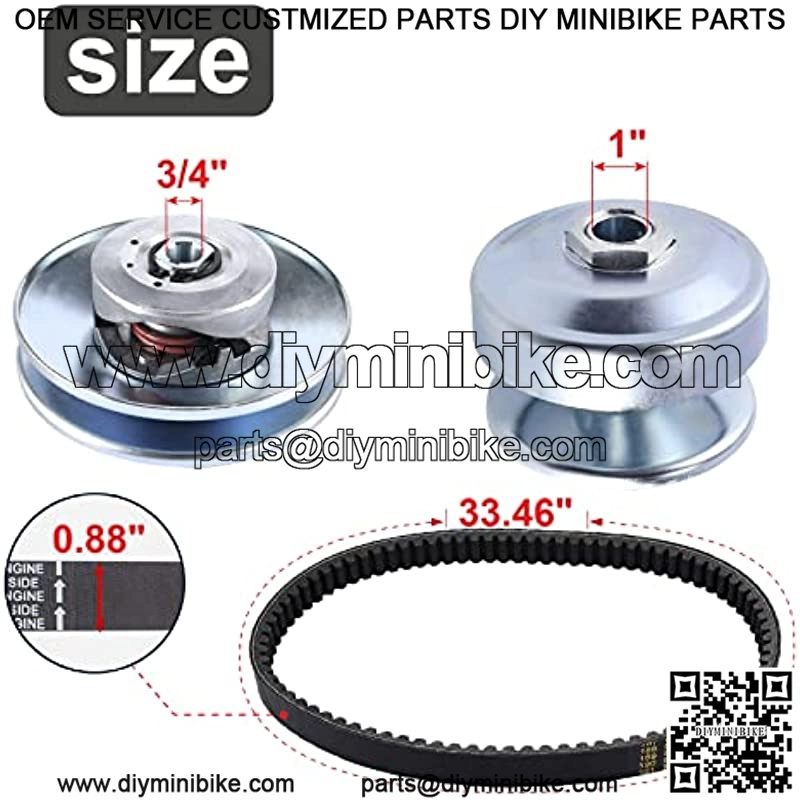 Package include 1X 1″ bore driver clutch pulley, 1X 3/4″ bore driven clutch pulley, 1X 203785 Belt??Length: 33.46”/850mm, Width: 0.88″/22.3mm)??.
