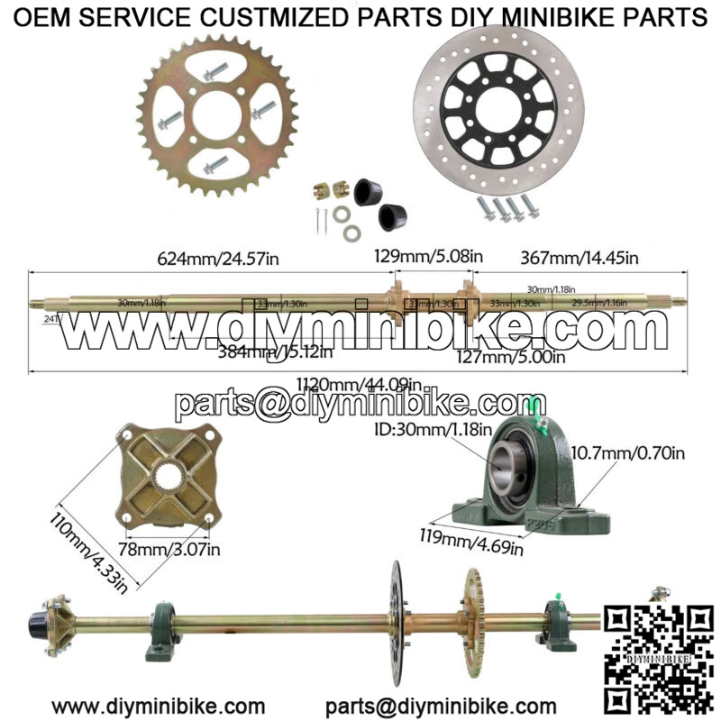 Specs:This is a live axle kit for DIY rebuild Go Kart, ATV, Quad and Drift TrikesAxle Overall length (from end to end): 1120mm (44″)The thickest part of the axle is 33mm (1.3″)Chain Sprocket: 530 37 Tooth 58mmBrake Disc Diameter: 220mm(8.66″)Spline teeth: 24TPackage includes : Rear Axle + Pair of pillow blocks + Sprocket + Brake Disc + Pair of 4 bolt wheel hubs
