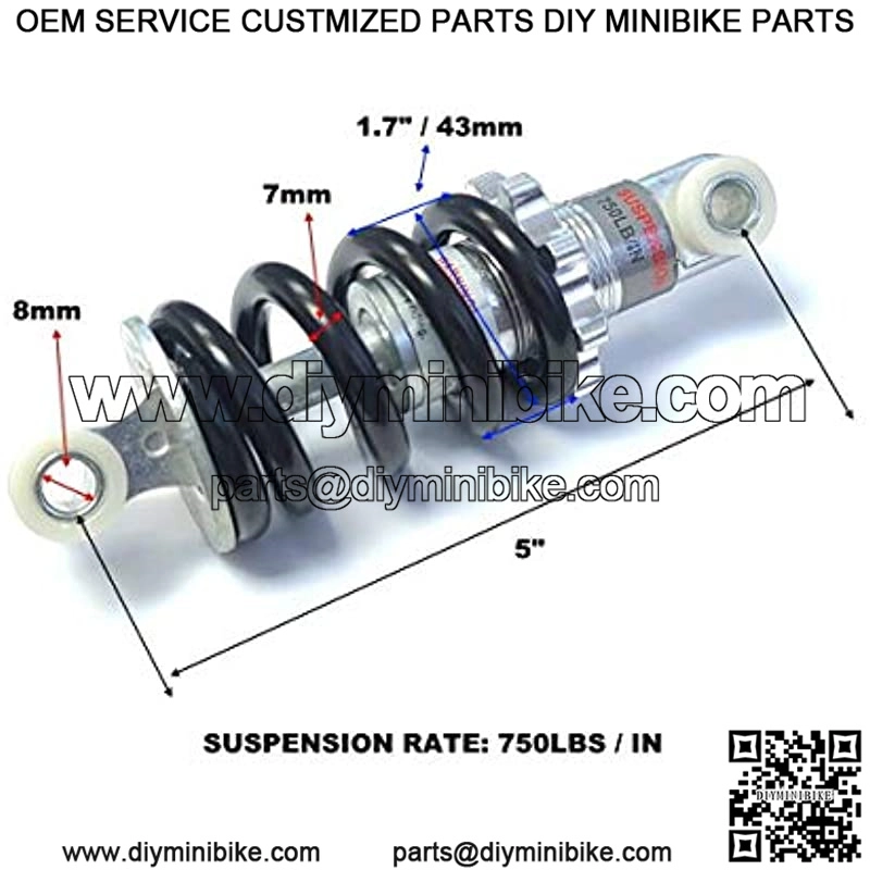 5″ inch Suspension Shock for Pocket Bikes, Scooters, Mini ATV, Bicycles, Mountain Bikes, Go Karts, Choppers, Custom DIY Projects, Measures 5″ from Bushing to Bushing. Spring Thickness: 7mm. Spring Rate: 750 lbs/in. Bushing Size: 8mm. Shock Width: 1.7″. Fits: 43cc 49cc X1 X2 Pocket Super Bikes, Scooters, Mini ATV’s, Bicycles, Mountain Bikes, Go Karts, Choppers, and Custom DIY Projects.