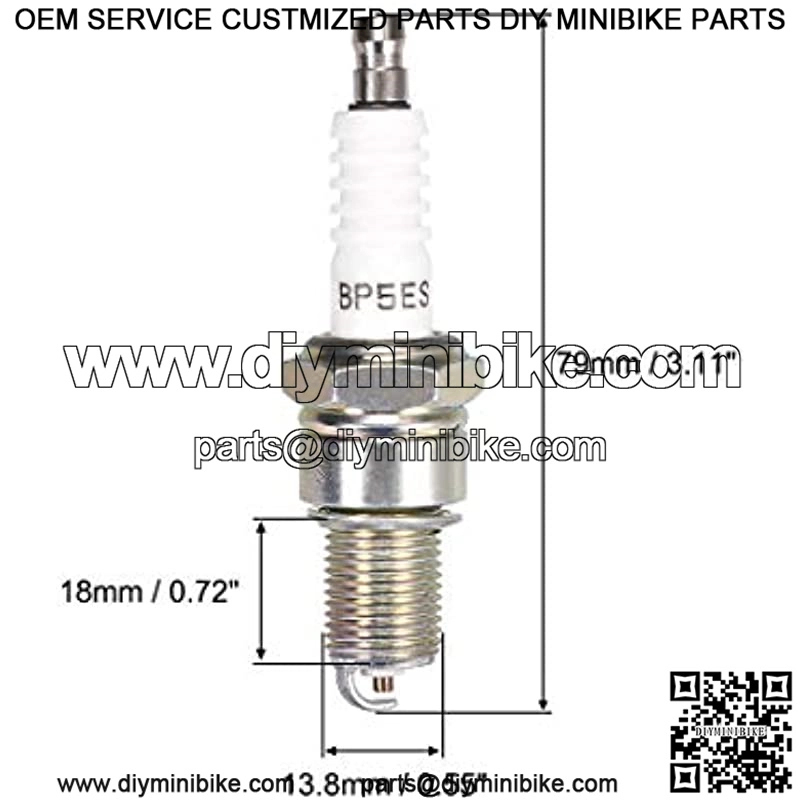 Model : BP5ES ; Package Include: 1pcs x Spark Plug. Thread Size: 18 x 13.8mm / 0.72 x 0.55inch (L*D); Thread Pitch: 1.25mm / 0.05inch; Total Size: 79 x 23mm / 3.11 x 0.91inch (L*D). High-temperature resistance, long service, and good reliability. Center electrode made from nickel for greater durability and lower voltage requirements. Replacement for Generator Tractor Go Kart Minibike.