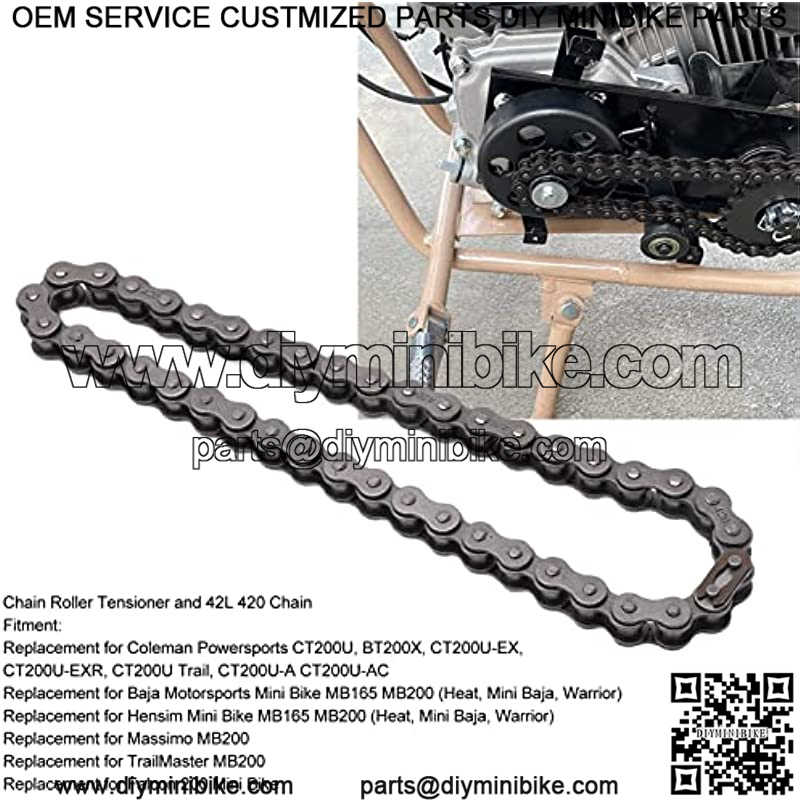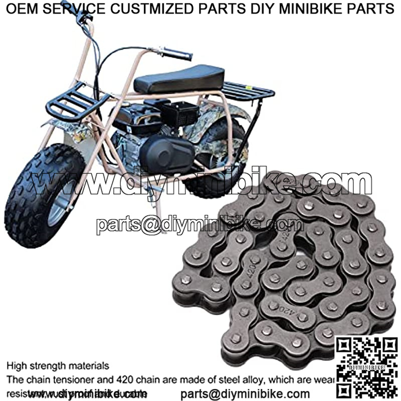 Chain function:Heavy Duty Chain Roller?? its 420 chain ensures engine life and the most efficient performance. The 420 main chain link can be used to adjust the chain length according to the condition of the mini bike, improve the insufficient performance of your original chain accessoand restore your driving power.
