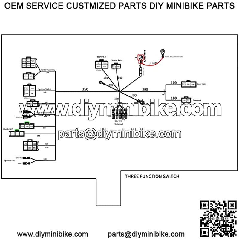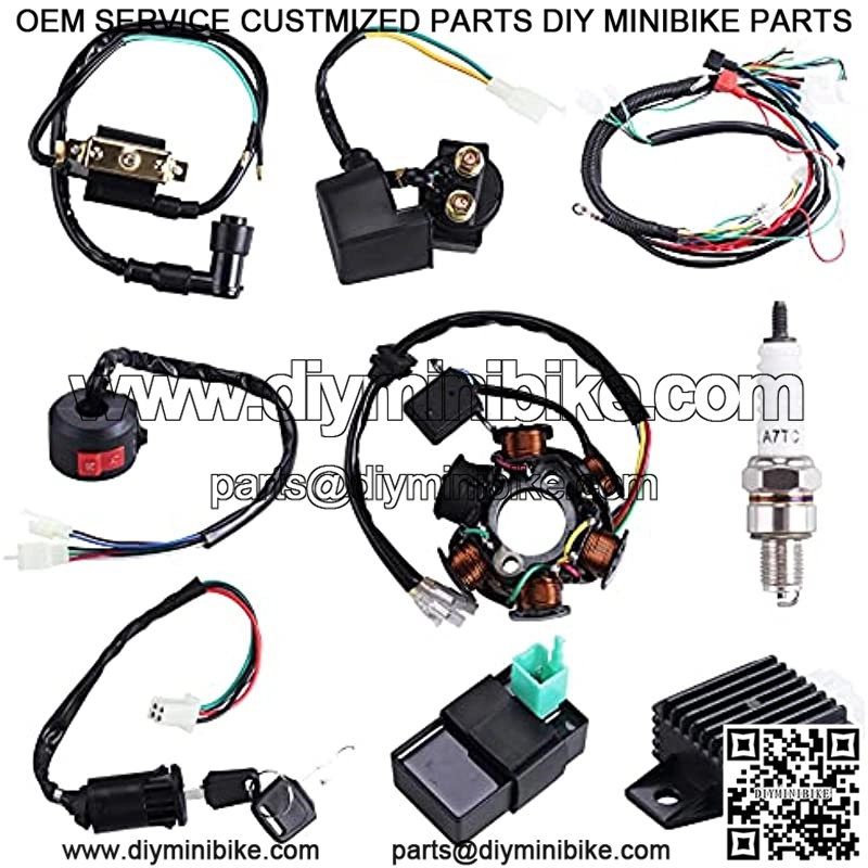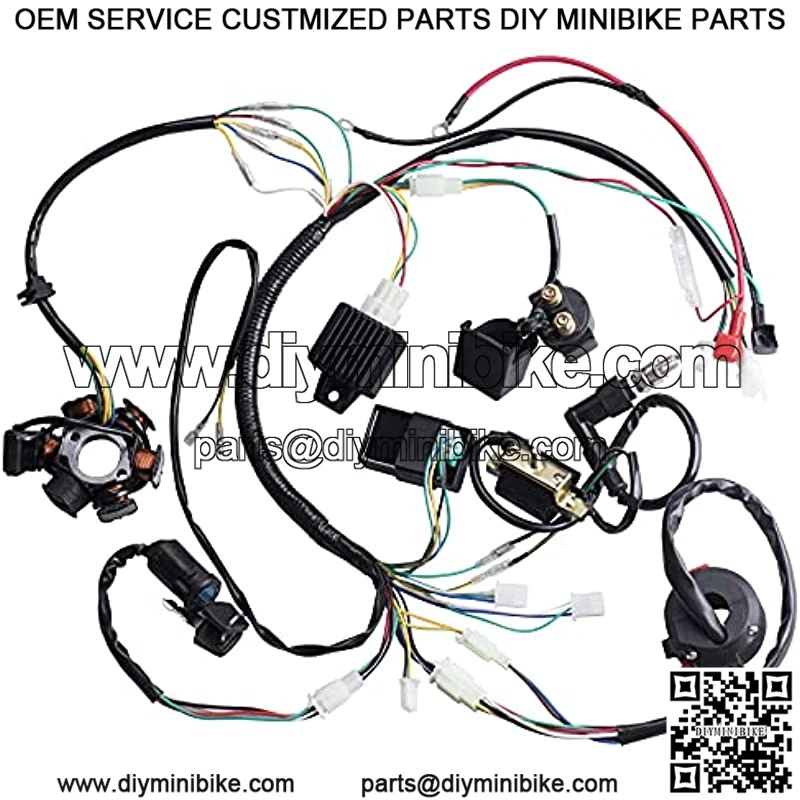 This is a complete electric start engine wiring harness loom,include 1x ATV Wire harness,1x CDI(5Pin AC),1x Solenoid Relay,1xRectifier (Voltage Regulator) ,1x Ignition Switch (2 keys, waterproof),1x Upgraded Multi-functional ATV Switch,1x Stator (Magneto Generator),1x Ignition Coil with lead, 1x Spark plug.