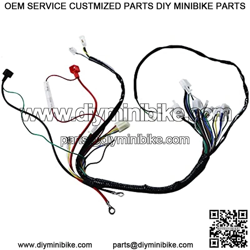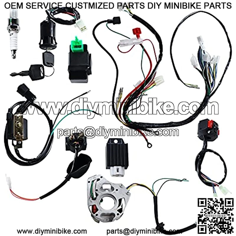 This is a complete electric start engine wiring harness loom,include 1x ATV Wire harness,1x CDI(5Pin AC),1x Solenoid Relay,1xRectifier (Voltage Regulator) ,1x Ignition Switch (2 keys, waterproof),1x Upgraded Multi-functional ATV Switch,1x Stator (Magneto Generator),1x Ignition Coil with lead and 1x Spark plug.