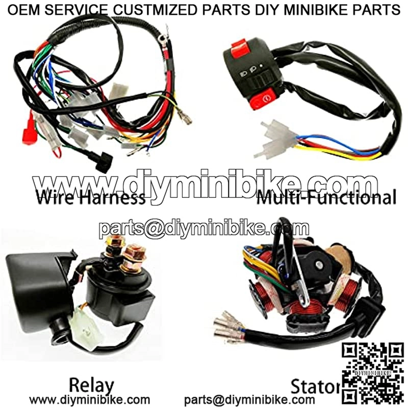 This is a complete electric start engine wiring harness loom,include 1x ATV Wire harness,1x CDI(5Pin AC),1x Solenoid Relay,1xRectifier (Voltage Regulator) ,1x Ignition Switch (2 keys),1x Upgraded Multi-functional ATV Switch,1 x ATV stator 6 coil,1x Ignition Coil with lead, 1x Spark plug