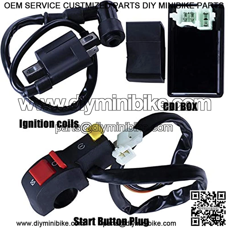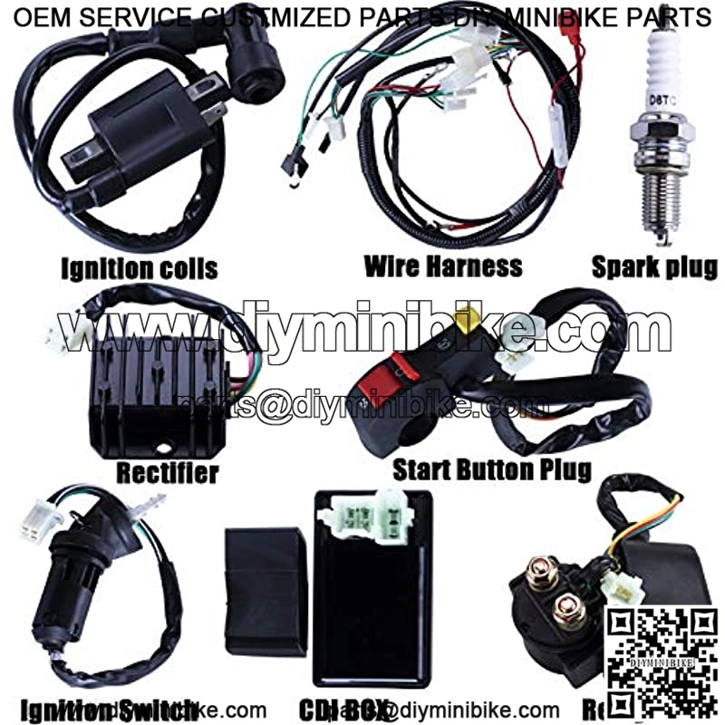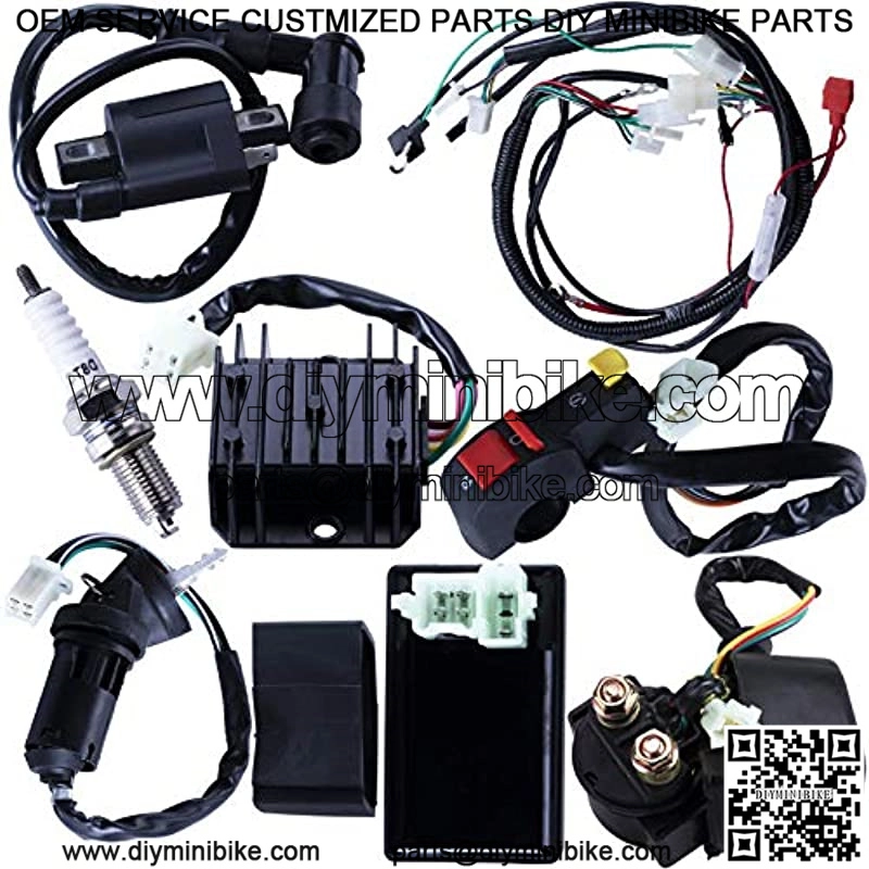 Package includes: 1x ATV Wiring Harness, 1x CDI(5Pin), 1x Solenoid Relay, 1xRectifier (Voltage Regulator), 1x Ignition Switch (2 keys, waterproof), 1x Start Button Plug, 1x Ignition Coil with lead and 1x Spark plug.Good value for money, easy for replacement.