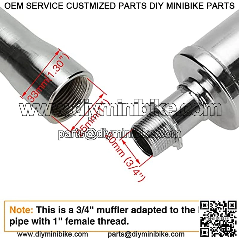??Fitment??fit for 79cc 98cc 100cc 196cc 212cc 224cc 301cc 420cc Predator 5.5hp 6.5hp engine ,7hp DuroMa* engine ,Hond* GX160 GX200, Harbor Freight,2hp-4hp Briggs and Stratton engine??Non-Hem/Hemi engine,Powerhorse 208cc ,212cc Tillotson,196cc Hisun engine and some other OHV Clone Small engines.??Fitment??Coleman CT200u CT200u-ex BT200x CT200U-EXR RB200 Trail 200, Massimo Baja MB200 MB165 ,Mega Moto 212cc Pro,Baja MB165 MB200 (Baja Heat,Mini Baja,Baja Warrior) Monste* Moto Classic 212cc Mini Bike, KT196,Hammerhead 80T,TrailMaster 200cc 163 Mini XRX/R+/XRS Realtre* RTK200 Go Karts, Lawn Mower ,Generators,and some Water Pumps??Pressure Washers??Motors which are equipped with the engine above.??Features??This is a 3/4″ muffler adpted to the header pipe with 1″ female thread.Easy to install.Nice welds and excellent chrome polish. It brings out the lowend sounds and it does not sound raspy at all.??Performance??High-temperature baking process makes it a great improvement in rust and high temperature r