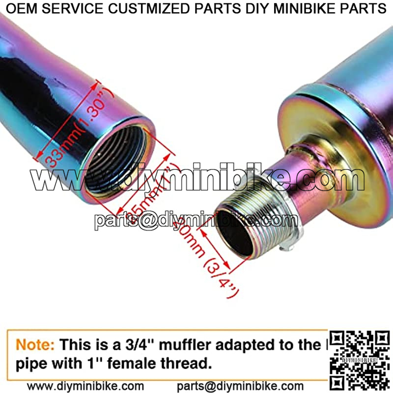 ??Note??Please make sure the exhaust pipe thread size is correct to this muffler before purchasing.Due to the irregular distribution of the colors painted on its surface, different mufflers may have a slight difference in color.Pay attention to the direction of the snap ring when installing.You can contact us by email if you have any questions.