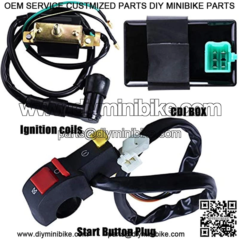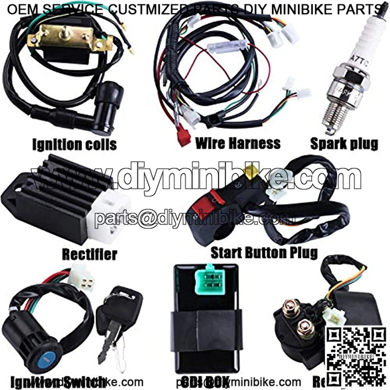 Package includes: 1x ATV Wiring Harness, 1x CDI(5Pin), 1x Solenoid Relay, 1xRectifier (Voltage Regulator), 1x Ignition Switch (2 keys, waterproof), 1x Start Button Plug, 1x Ignition Coil with lead and 1x Spark plug.Good value for money, easy for replacement.