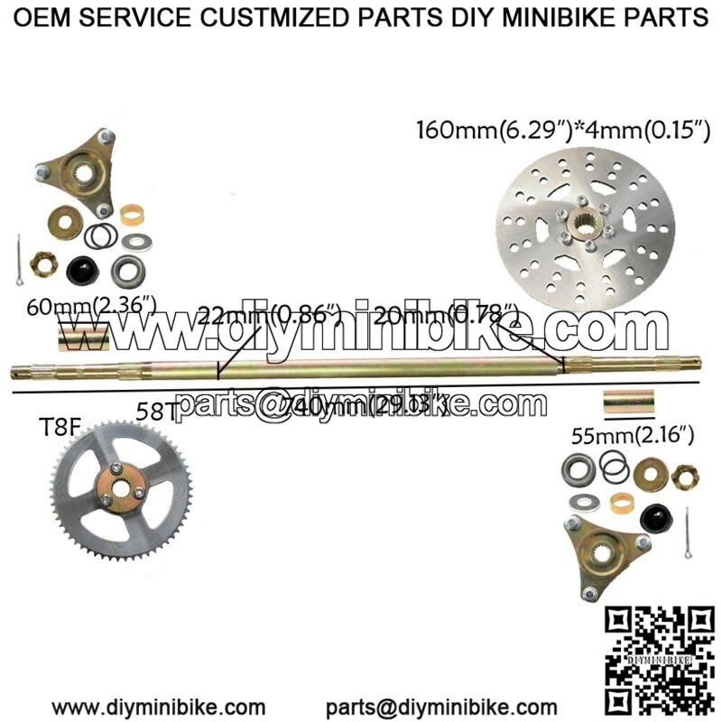 Measurement: Length: 740mmDisc: 160mm*4mmSprocket: T8F 58TBearing model: 6904RSThis is a complete rear axle kits for gokartPerfect for DIY gokart projects or rebuildsFit many 50cc 70cc 90cc atv quads, go karts such as atomik , motowork, DHZ , LEI etcPackage includes: 3 stud hubs, disc and sprocket carriers, bearings and seals in axle bearing housing
