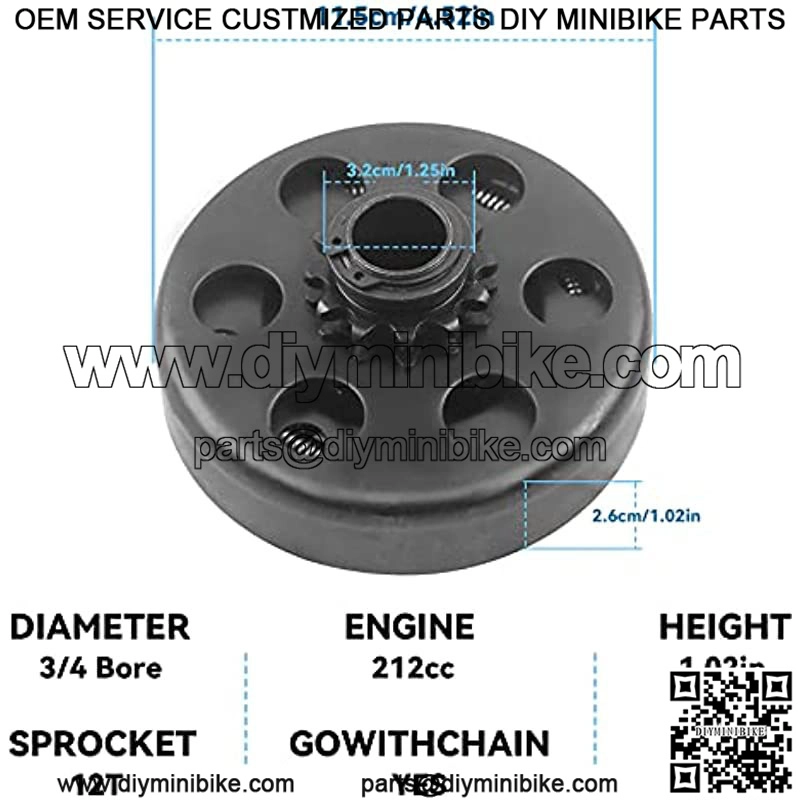 Go kart tractor mini bike centrifugal clutch 12 tooth, 3/4″ bore, use 35# chain. The clutch 3/4″ bore 12 tooth 35 chain fits Honda GX160, GX200, GX 140, GX120, GC160, GC190, for Harbor Freight Greyhound 196cc and Harbor Freight Predator 212cc Also fits any other engines with 3/4 crank shaft and 3/16?? key way, most 5.5 HP clones, 6.5 HP clones and 4-7HP motors. The Clutch also fits for 2 – 6.5 HP 168 188 gasoline engines for generator and go kart single wheel drive karts. Predator 2.8 HP 97cc engine with 3/4 inch output shaft with standard keyway. Centrifugal Clutch 3/4″ Bore #35 Chain 12T For Go Kart Mini Bike Engine 3/4 Bar Specifications: Material: IronClutch Bore: 3/4″Sprocket: 12 toothEngagement Speed: 2200??200 RPMFitment: Mini Bike, Go KartRecommended Engine: 2HP – 6.5HP, 3/4″ Shaft Fits: This Clutch Will Fit 2 – 6.5 HP Engines Honda GC160, GC190, GX120, GX140, GX160, GX200Also will fit Briggs & Stratton and 2 –