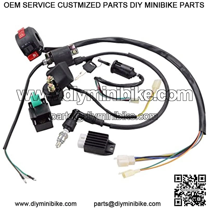 This is a complete electric start engine wiring harness loom.Package including ignition switch,spark plug,kill switch,solenoid relay,CDI(come as picture show)