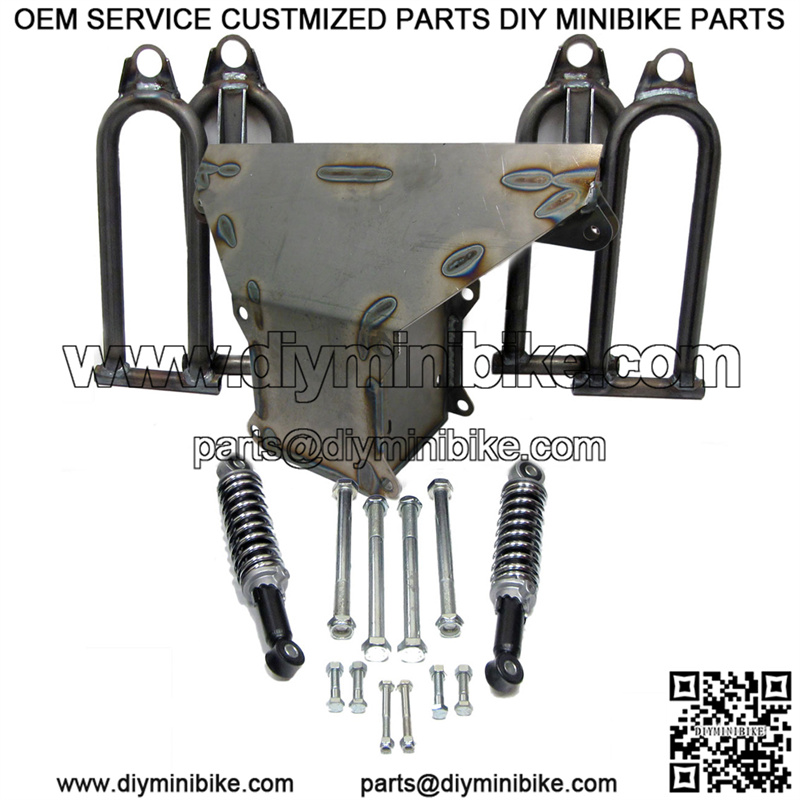 This is a front end assembly for the Spiderbox series go karts from . This complete front end was used on early Spiderbox models, that have a bronze bushing and sleeve in the a-arms. The center box is drilled to utilize a 1/2″ bolt.