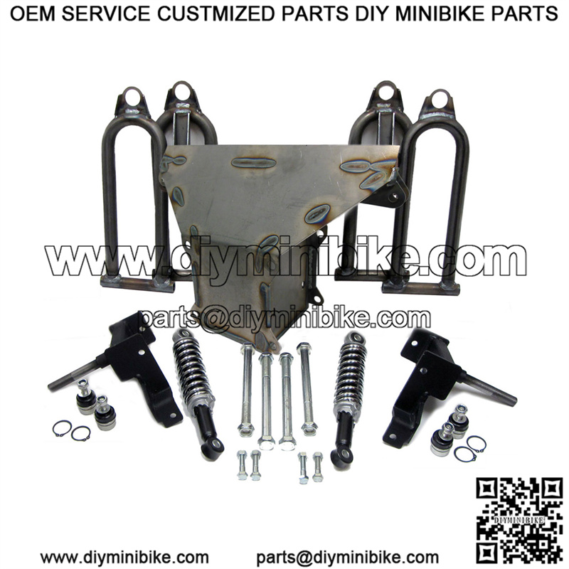 This is a front end assembly for the Spiderbox series go karts from . This complete front end was used on early Spiderbox models, that have a bronze bushing and sleeve in the a-arms. The center box is drilled to utilize a 1/2″ bolt.