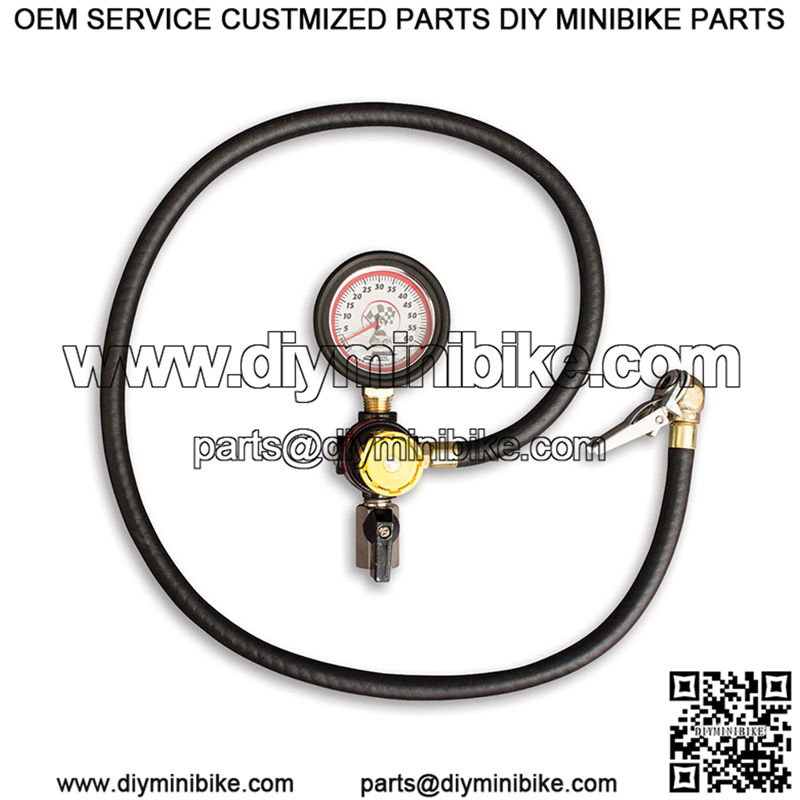 Regulator and tire pressure gauge, hose with clip-on chuck, regulator valve
