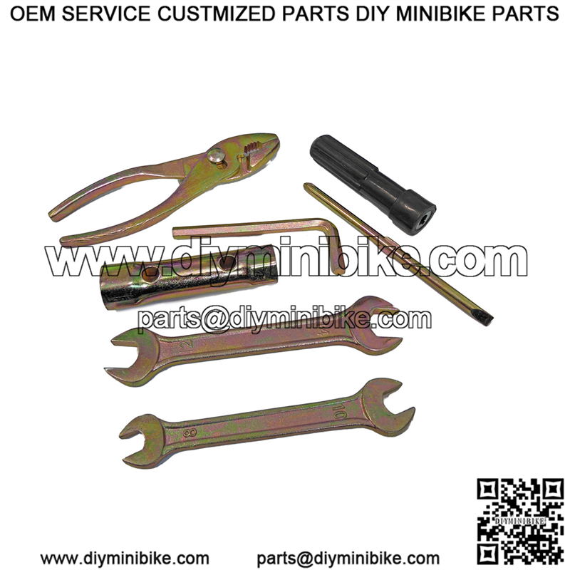 Includes: Wrench 12mm /14mm, Wrench 8mm / 10mm, Allen Wrench, Phillips / Flathead Screw Driver, Pliers, and Socket