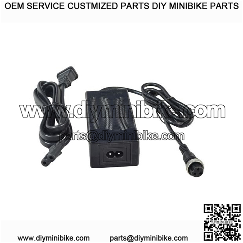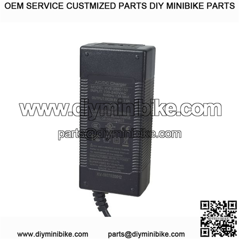 You will agree that it is a top performer for your money Our premium quality 24 volt inline battery charger is made by AlveyTech, and is a first-rate 3-prong battery charger for use on many of today’s popular electric mini bike models. You will agree that it is a top performer for your money.Many people prefer this older inline style charger that uses a pair of cords; one from the wall outlet to the charger, and one from the charger to the batteries’ charging port. This allows better flexibility around the workbench without a big plastic charger case taking up the entire electrical receptacle.This 24 volt mini bike charger is also compatible with many 24 volt electric scooters that require a 3-prong charging connector. We carry a 3-prong battery charger for most mini bikes and scooters that use a 24 volt battery system.LED DisplayGreen: Charged OKRed: ChargingThis is a premium quality 24 volt battery charger that is Underwriters Laboratories listed with an automatic shut-off feature. AlveyTech model number: XVE-2880150