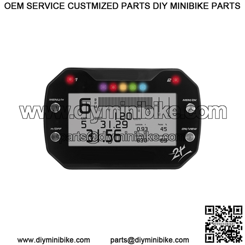 The has a high-resolution graphical display for the indication of rpm, speed,lap times, gear, one temperature, satellite reception and the data from the connected expansions as the lambda or MC-Expansion. It is possible to configure several display pages free and to select them over the 4 buttons. The display-illumination can be set in 7 different colors and the brightness is controlled by a light-sensor.
