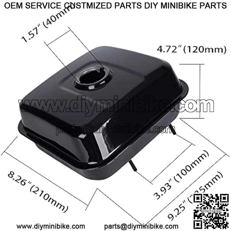 Dimensions : Height of the mini bike gas tank: 4.72″/120mm; Width: 8.26″/210mm; Length: 9.25″/235mm; Bolt to Bolt: 3.93″/100mm; Capacity: 0.81 Gallon(3L)
