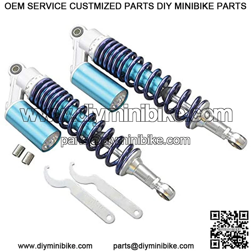 One pair universal fit ATV Go kart shocks. ( 1 x Left + 1 x right)Shock strength is adjustable. Easy to install.Fit on most 150cc~750cc Sport bikes, like Honda Suzuki Yamaha Kawasaki and ATV, UTV, Dirt Bikes, Go-kart and Moped Quad.Fit bikes with shocks of 375mm eye to eye distance. Please make sure the size fits your bike before placing the order.Packaged Included: 1 Pair Shock AbsorbersColor:375MM BlueFitment:Universal Fit. Work perfectly on most 150cc~750cc street bikes, Scooters and Moped Quad (ATV) with shocks of 375mm eye to eye distance. Great choice for replacement, style upgrading and all kinds of bike modification. **Please check below dimension before bidding.Specification:Condition: 100% Brand NewTotal Length: 400mm (15.75″)Length of Eye to Eye Core: 375mm (14.75″)Eye Diameter(with bushing): 12mmEye Diameter(with bushing removed): 16mmEye Thickness: 21mmEye Maximum Tensile Strength: 2,000 KgfSpring Thickness: 8mmSpring Width: 60mmWorking Stroke: 68mmSpring Stiffness: 110 kg