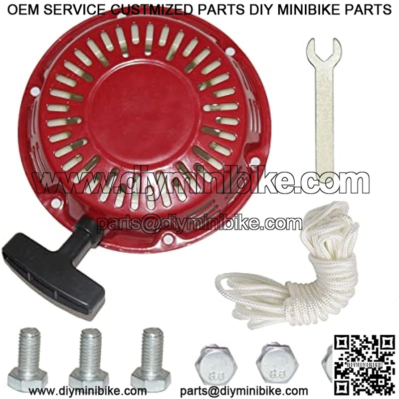 Package included: 1pcs x recoil starter, 6pcs x mounting screws, 1pcs x( 4mm) 5m pull cord, 1pcs x wrench.
