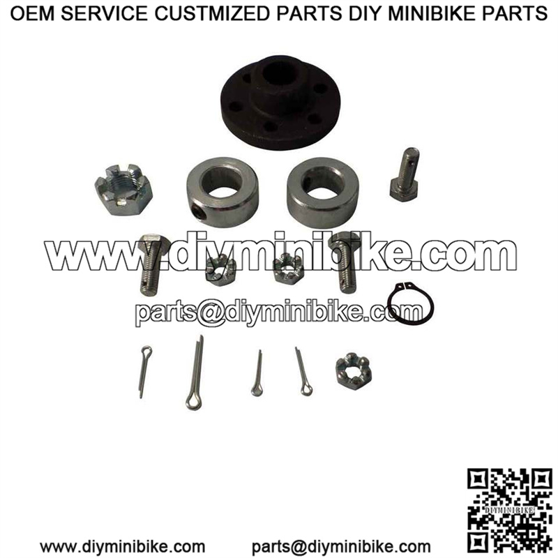 Steering Shaft Hardware Kit, Less Shaft, without Pitman Arms Kit Includes: (1) AZ8134- Hub, splined, for 5/8″ OD steering shaft, 2 bolt circles, (3) AZ8412- Bolt, 1/4-28 X 3/4″, 1/16″ hole drilled 3/32″ from end, zinc plated (1) AZ8418- Cotter pin, 3/32″ X 3/4″, zinc plated, (3) AZ8419- Cotter pin, 1/16″ X 1/2″, zinc plated (3) AZ8527- Slotted hex nut, 1/4-28, zinc plated, (1) AZ8528- Slotted hex nut, 1/2-20, zinc plated (2) AZ8554- Collar, One piece steel, 5/8″ ID X 1-1/8″ OD X 1/2″ wide, zinc plated & set screw