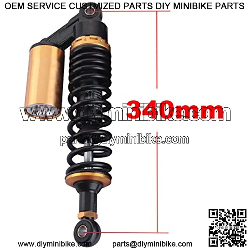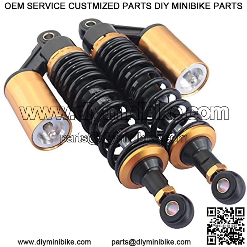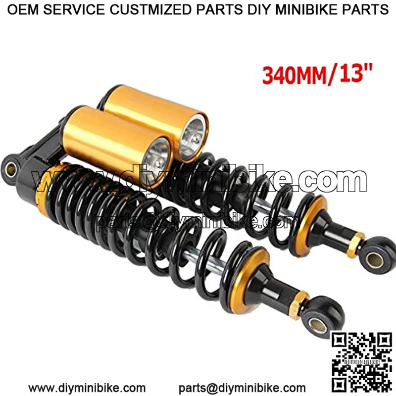 Motorcycle shock absorber universal fit for most vehicles, like Honda/Yamaha/Suzuki/Kawasaki, etc. The diameter of the round hole at the bottom is 12mm. Fit bikes with shock absorbers of 340mm eye to eye distance.Shock strength adjustable. Best choice for replacement, style upgrading or bike modification.Please check the size details and make sure it will fit your bike before purchase.The coil-over springs and air cylinder are helpful to reduce the shock. Delivered in 7 work days.Package included: One Pair Shock Absorber, 2 X Wrench, 2 X 12mm Tubes[10mm or 14mm tube bushes ,Clevis Ends(U-Types or Round Eyes) are also available in our store.]Color:340 Black and GoldItem: 340mm Motorcycle Shock Absorber One PairColor: As the pictures showsInstallation Type: Eye to EyeDistance from eye to eye: 340mm (13.4″)Working strobe: 68mmSpring Thickness: approx. 8mmMaximum load: 300 kg (??660 lbs)Top and bottom hole diameter:12mmMaterial: Aluminium and solid steelPlacement on Vehicle: Rear,Left,Right