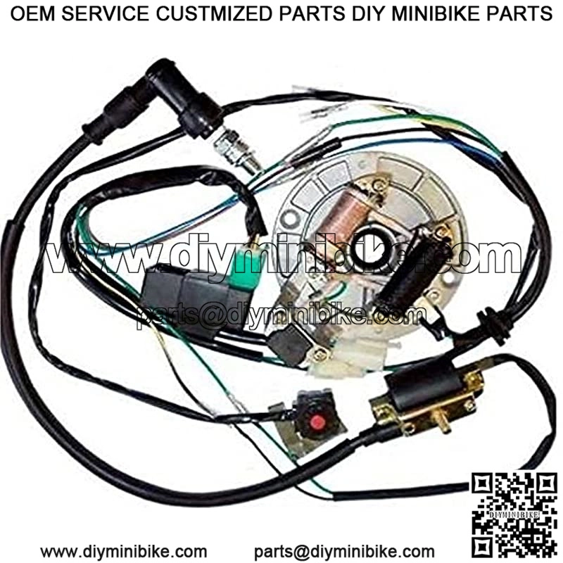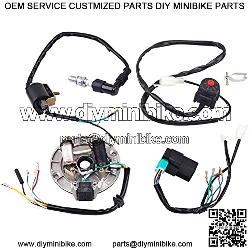 Kit includes: CDI, ignition coil, spark plug, kill switch, wire harness, magneto, stator ignition plate, magneto flywheel